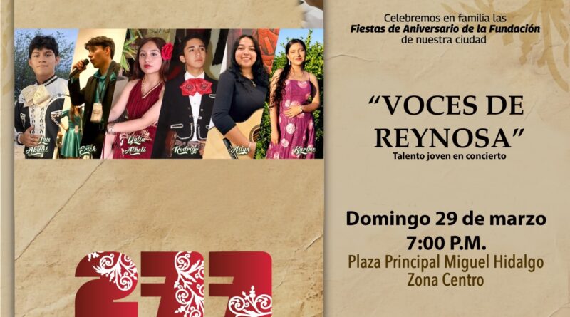 El Gobierno de Reynosa, que preside el Alcalde Carlos Peña Ortiz, invita a festejar 277 años de la fundación de la ciudad este domingo 29 de marzo con eventos gratuitos en dos puntos diferentes a partir de las 7:00 P. M. Quienes disfrutan de la música tienen una cita en la plaza principal «Miguel Hidalgo», en la zona Centro, para el concierto «Voces de Reynosa», con la participación de jóvenes artistas locales, quienes serán presentados por el Instituto Reynosense para la Cultura y las Artes. Por otra parte, el gusto por el danzón se vive en la plaza «Treviño Zapata» de la colonia Longoria, donde los Maestros Josué Carlos Rodríguez Vega y Yerania Ymelda Zúñiga Rodríguez ayudarán a los asistentes a lucir sus mejores pasos en la pista